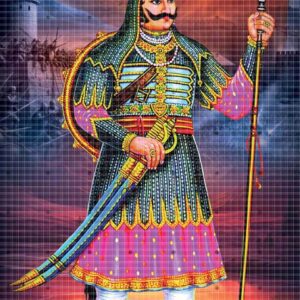 This is a powerful image of Maharana Pratap, the legendary Rajput king known for his valor and resistance. He is depicted standing upright, holding a spear in one hand and a sword sheathed at his side. Dressed in traditional warrior armor and a royal turban, he exudes strength and authority. His facial expression is calm yet fierce, reflecting his determination and courage. The image symbolizes his unwavering spirit and heroic legacy.