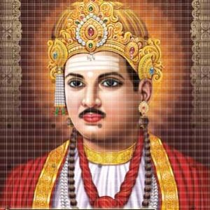 This image is a devotional representation of Lord Basaveshwara, also known as Basavanna, a revered philosopher, social reformer, and the founder of the Lingayat movement. He is shown wearing a royal crown and traditional attire, adorned with jewelry and sacred symbols. A divine aura surrounds his head, signifying spiritual enlightenment and wisdom. His calm and dignified expression reflects his role as a visionary and spiritual leader. The image honors his contributions to social equality, devotion, and moral values.