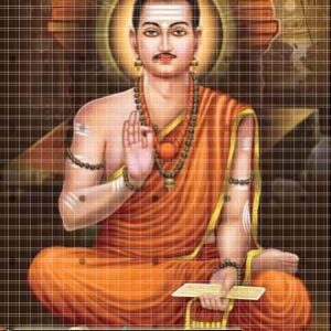 This is a devotional image of Ulavi Channa Basaveshwara, depicted with a serene and compassionate expression. He is shown wearing traditional attire, adorned with sacred beads around his neck. A radiant halo surrounds his head, symbolizing his spiritual enlightenment. His right hand is raised in a blessing gesture, conveying peace and divine grace. The calm background enhances the sacred and devotional atmosphere of the image.