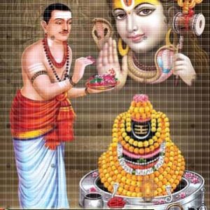 This devotional image depicts Ulavi Channa Basaveshwara performing a ritual offering to Lord Shiva. He is shown in traditional attire, holding a plate of flowers and sacred items as part of the worship. Lord Shiva’s divine face appears in the background, symbolizing his blessings and presence. In front of him is a beautifully decorated Shiva Lingam adorned with flowers and sacred symbols. The image highlights Ulavi Channa Basaveshwara’s deep devotion and spiritual connection to Lord Shiva.