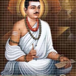 This image portrays Ulavi Channa Basaveshwara seated in a calm and composed posture. He is dressed in traditional white attire with sacred beads around his neck and holds a palm leaf manuscript and a pen, symbolizing knowledge and wisdom. A radiant halo surrounds his head, signifying his spiritual enlightenment. His serene expression reflects deep contemplation and devotion. The setting evokes a peaceful and devotional atmosphere, emphasizing his role as a revered saint and scholar.