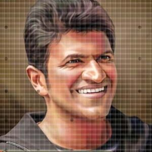 This is a digitally enhanced portrait of Puneeth Rajkumar, a celebrated Indian actor and playback singer. The image captures him in a moment of genuine happiness, smiling warmly . The portrait emphasizes his lively and charismatic presence, reflecting the charm and positive energy he was known for.