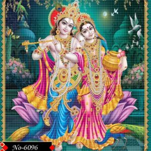 Radha and Krishna bask in eternal affection, Krishna’s flute resonates with spiritual grace.