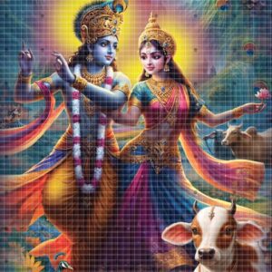 This sacred poster showcases Radha and Krishna’s celestial presence.