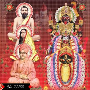 This powerful devotional image features Sri Ramakrishna Paramahamsa, Holy Mother Sarada Devi, and Swami Vivekananda, symbolizing the spiritual trinity of modern Indian spirituality. The expressions of the three saints convey calm wisdom, devotion, and unwavering spiritual strength. The monochrome tones with red highlights emphasize the sacred and timeless nature of the scene. This artwork beautifully captures the essence of Sanatan Dharma, devotion, and the eternal connection between guru, disciple, and the Divine Mother.
