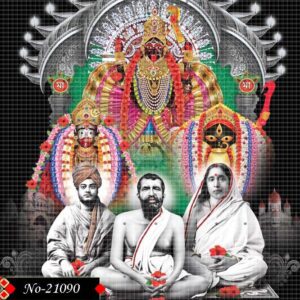 This powerful devotional image features Sri Ramakrishna Paramahamsa, Holy Mother Sarada Devi, and Swami Vivekananda, symbolizing the spiritual trinity of modern Indian spirituality. Behind them, the intense and divine face of Goddess Kali emerges in a radiant red and black form, reflecting cosmic energy and divine power. The expressions of the three saints convey calm wisdom, devotion, and unwavering spiritual strength.