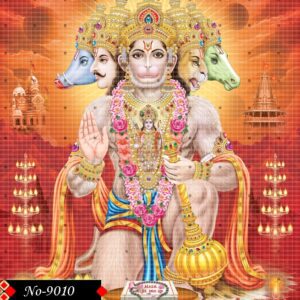 This image depicts the powerful and multi-headed form of Hanuman, known as Panchamukhi Hanuman, a significant deity in Hinduism. The central figure is Hanuman, adorned with elaborate golden crowns and intricate jewelry, including necklaces and armbands. He is seated with one leg bent, holding a mace (gada) on the ground beside him, symbolizing his strength and martial prowess.ers blessings with his open palm. The golden gada resting in his left hand emits divine authority.