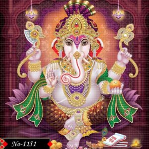 Ganesha is adorned in a rich purple and gold patterned dhoti and a matching ornate crown, seated on a stylized purple lotus. His expression is peaceful and serene, characteristic of devotional art, set against a backdrop of deep purple hues and arched architectural elements. The overall style is intricate and traditional, emphasizing his divine and auspicious presence.