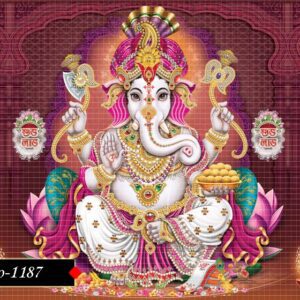 Ganesha is depicted with a colorful crown and a white body adorned with vibrant pink and gold patterns, seated on a pink and teal lotus. His expression is serene and benevolent, with four arms holding symbolic items including an axe, a goad, and a bowl of sweets, with one hand in the abhaya mudra. The background features a rich maroon arched alcove with auspicious symbols. Offerings of flowers and a lit diya are placed at his feet, creating a devotional atmosphere.