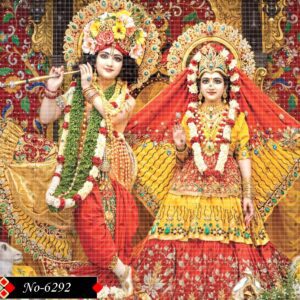 This image features Radha and Krishna, depicted in opulent saffron yellow garments . Krishna, on the left, plays a golden flute, his head crowned with a magnificent floral arrangement and a peacock feather. Radha, on the right, stands gracefully, her hands posed in a gesture of welcome or blessing.