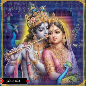 The image glows with divine emotion, Radha and Krishna in loving motion. Delicate jewelry and detailed attire, Adorn their form with celestial fire.