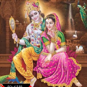 This captivating image portrays Radha and Krishna seated together in a lush. Krishna, on the left, holds a golden mirror with a reflection of Radha within it, signifying their inseparable bond. He is adorned with a regal crown, vibrant garlands, and intricate jewelry.