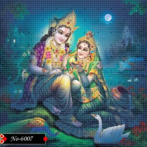 Radha and Krishna sit side by side in moonlight, krishna gently holding the divine flute. Golden jewelry gleams over their intricately designed garments, while their radiant skin and soulful expressions embody eternal love.
