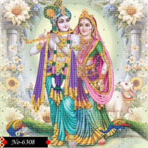 Radha, adorned in a vibrant purple saree, lovingly leans beside him.
