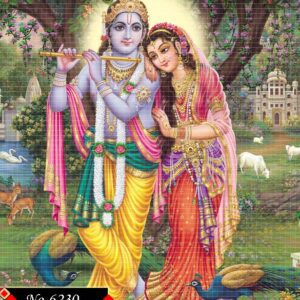 This vibrant image depicts Radha and Krishna, central figures in Hindu mythology, standing together in a lush, pastoral setting.