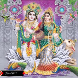 Radha and Krishna’s divine faces glow with serene beauty, enhanced by intricate golden adornments. Krishna holds his bansuri, while a divine cow rests below, with a majestic temple softly framing the heavenly background.