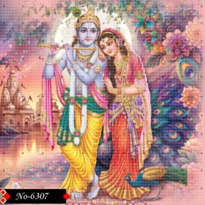 Radha, adorned in a vibrant saree, lovingly leans beside him.