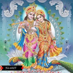 Radha and Krishna’s faces reflect divine love and serenity. The detailed embroidery on their attire shines with spiritual elegance.