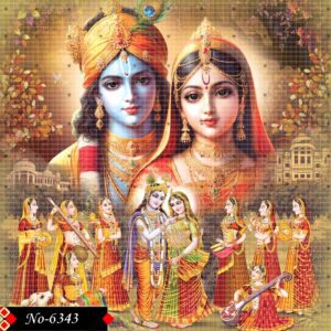 In this vibrant depiction, Radha and Krishna’s faces are full of divine life. Krishna’s blue skin and jewel-studded crown exude calmness and royalty. Radha, radiant with gold ornaments and a red bindi, stands lovingly close. The duo looks blissful, immersed in the divine bond of love.