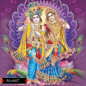 A peaceful moment where Krishna plays the flute and Radha stands by, both glowing with divinity. Their golden jewelry glimmers, the detailed temple looms in the distance, and a calm peacock graces the foreground.