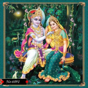 Radha sits beside him, graceful in a shimmering green and gold sari, with a light yellow veil.