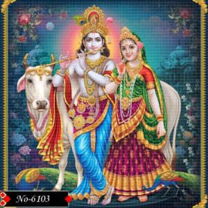 Radha and Krishna stand close in divine harmony, Golden jewels sparkle in their serene glow.
