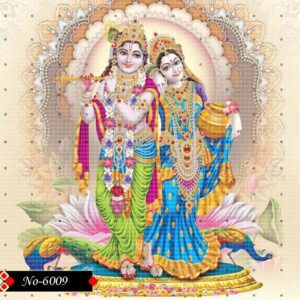 Krishna’s glowing blue skin contrasts beautifully with Radha’s gentle aura.