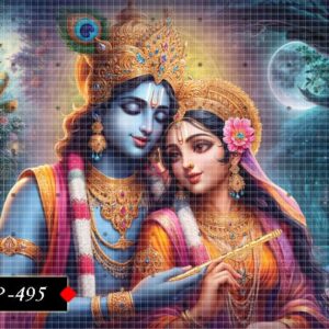 A spiritually rich poster showing Radha and Krishna in divine embrace.