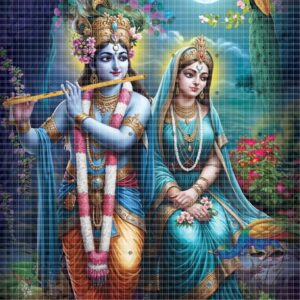 This artistic poster brings alive the divine embrace of Radha and Krishna.