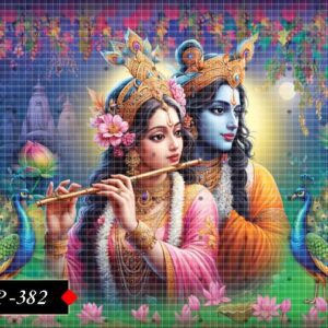 A spiritually rich poster showing Radha and Krishna in divine embrace.