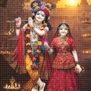 Radhamadhab appear in this image with divine poise and peaceful presence. Their garlanded forms, surrounded by intricate background elements, radiate calm. The craftsmanship in this poster celebrates sacred tradition. It serves as a constant reminder of grace and devotion.