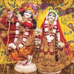 In this devotional image, Radhamadhab are portrayed in radiant divine attire with floral garlands and celestial expressions. Their presence creates an atmosphere of deep calm and sacred energy. The ornamental details highlight the richness of spiritual tradition. A poster that uplifts and connects the soul to the divine.
