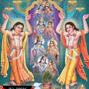 This image gracefully presents Chaitanya Mahaprabhu and Nityananda Prabhu dancing in divine ecstasy. Adorned in sacred attire, they are surrounded by the glowing presence of Radha-Krishna making this a radiant portrayal of devotion and divine unity.