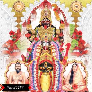Ramakrishna and Sarada Devi, calm and enlightened, sit before divine forms of Goddess Kali. The entire image glows with divine brilliance, inspiring a deep sense of devotion, purity, and spiritual awakening.