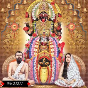 A divine vision unfolds with Sri Ramakrishna and Sarada Devi at the forefront, their expressions serene and enlightened. Goddess Kali radiates power and purity in the backdrop, bathing the scene in sacred light and divine energy.