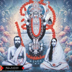 This spiritual artwork presents Ramakrishna Paramahamsa and Holy Mother Sarada Devi surrounded by aura of peace. In the background, the majestic figure of Goddess Kali glows with celestial power, evoking profound devotion.