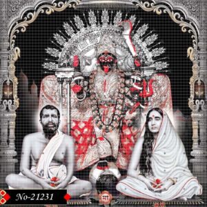In this sacred portrait, Ramakrishna and Sarada Devi gaze with calm devotion, surrounded by an aura of divine light. Behind them, the resplendent form of Goddess Kali radiates eternal power and protection.