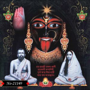 This devotional image features Sri Ramakrishna and Holy Mother Sarada Devi in serene grace. Behind them, Goddess Kali glows in divine brilliance, creating a spiritual ambiance filled with light, peace, and divine blessings.