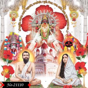 This spiritual artwork presents Ramakrishna Paramahamsa and Holy Mother Sarada Devi surrounded by a golden aura of peace. In the background, the majestic figure of Goddess Kali glows with celestial power, evoking profound devotion.