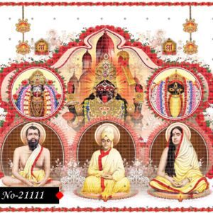 This divine image showcases Sri Ramakrishna Paramahamsa, Holy Mother Sarada Devi, and Swami Vivekananda seated in deep meditation, symbolizing the foundation of spiritual awakening and devotion. Behind them stands the radiant and majestic form of Goddess Kali, adorned in vibrant red garments, lavish jewelry, and surrounded by a celestial aura of divinity.