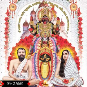 In this holy depiction, Goddess Kali stands fiercely over symbolic evil, while her devotees sit in peace. Ramakrishna and Sarada Devi meditate beside her, symbolizing the spiritual path of devotion and surrender. The divine forms are framed by a tranquil water setting. The scene is enhanced by traditional sacred architecture in the backdrop. Each element complements the others to express balance between divine strength and human spirituality. This image invites contemplation and faith.