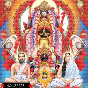 This holy depiction shows Ramakrishna Paramahamsa and Sarada Devi in peaceful unity, enveloped in golden light. The towering presence of Goddess Kali in the background completes the image of divine harmony.
