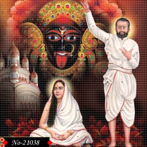 An aura of divinity surrounds Sri Ramakrishna and Sarada Devi, while the glowing figure of Goddess Kali rises in the backdrop. The entire composition is a testament to spiritual strength, devotion, and divine connection.