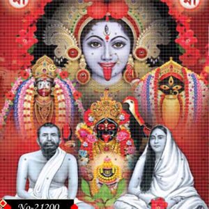 This holy depiction shows Ramakrishna Paramahamsa and Sarada Devi in peaceful unity, enveloped in golden light. The towering presence of Goddess Kali in the background completes the image of divine harmony.