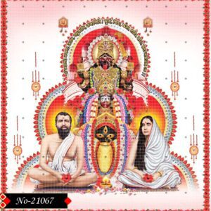 In this holy depiction, Goddess Kali stands fiercely over symbolic evil, while her devotees sit in peace. Ramakrishna and Sarada Devi meditate beside her, symbolizing the spiritual path of devotion and surrender. The divine forms are framed by a tranquil water setting. The scene is enhanced by traditional sacred architecture in the backdrop. Each element complements the others to express balance between divine strength and human spirituality. This image invites contemplation and faith.