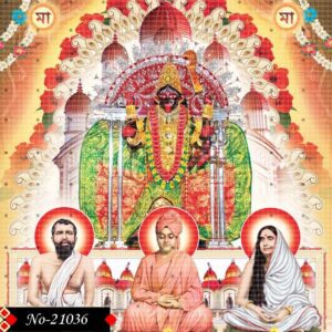 This powerful devotional image features Sri Ramakrishna Paramahamsa, Holy Mother Sarada Devi, and Swami Vivekananda, symbolizing the spiritual trinity of modern Indian spirituality. Behind them, the intense and divine face of Goddess Kali emerges in a radiant red and black form, reflecting cosmic energy and divine power. The expressions of the three saints convey calm wisdom, devotion, and unwavering spiritual strength. The monochrome tones with red highlights emphasize the sacred and timeless nature of the scene.