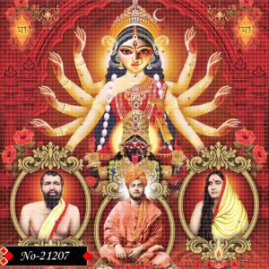 This powerful devotional image features Sri Ramakrishna Paramahamsa, Holy Mother Sarada Devi, and Swami Vivekananda, symbolizing the spiritual trinity of modern Indian spirituality.