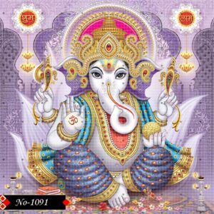 Lord Ganesha — adorned in royal blue with golden ornaments and an aura of serenity. The subtle lavender background with “शुभ” and “लाभ” adds a sacred and auspicious touch.