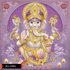 This majestic portrayal of Lord Ganesha features Him seated in a divine posture against a regal lavender background, symbolizing peace and spiritual wisdom. Adorned with a richly embellished golden crown and jewelry, Ganesha holds sacred items including the axe, modak, and lotus, while blessing devotees with His upraised hand. The artwork is accented with glowing diyas, sacred scriptures, and the auspicious words Shubh and Labh, enhancing the divine charm.
