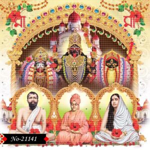 This sacred artwork presents Sri Ramakrishna Paramahamsa, Holy Mother Sarada Devi, and Swami Vivekananda seated in meditation, reflecting the pillars of spiritual enlightenment. Towering behind them is the divine images of Goddess Kali, exuding power and grace, adorned with resplendent ornaments and a radiant divine presence.